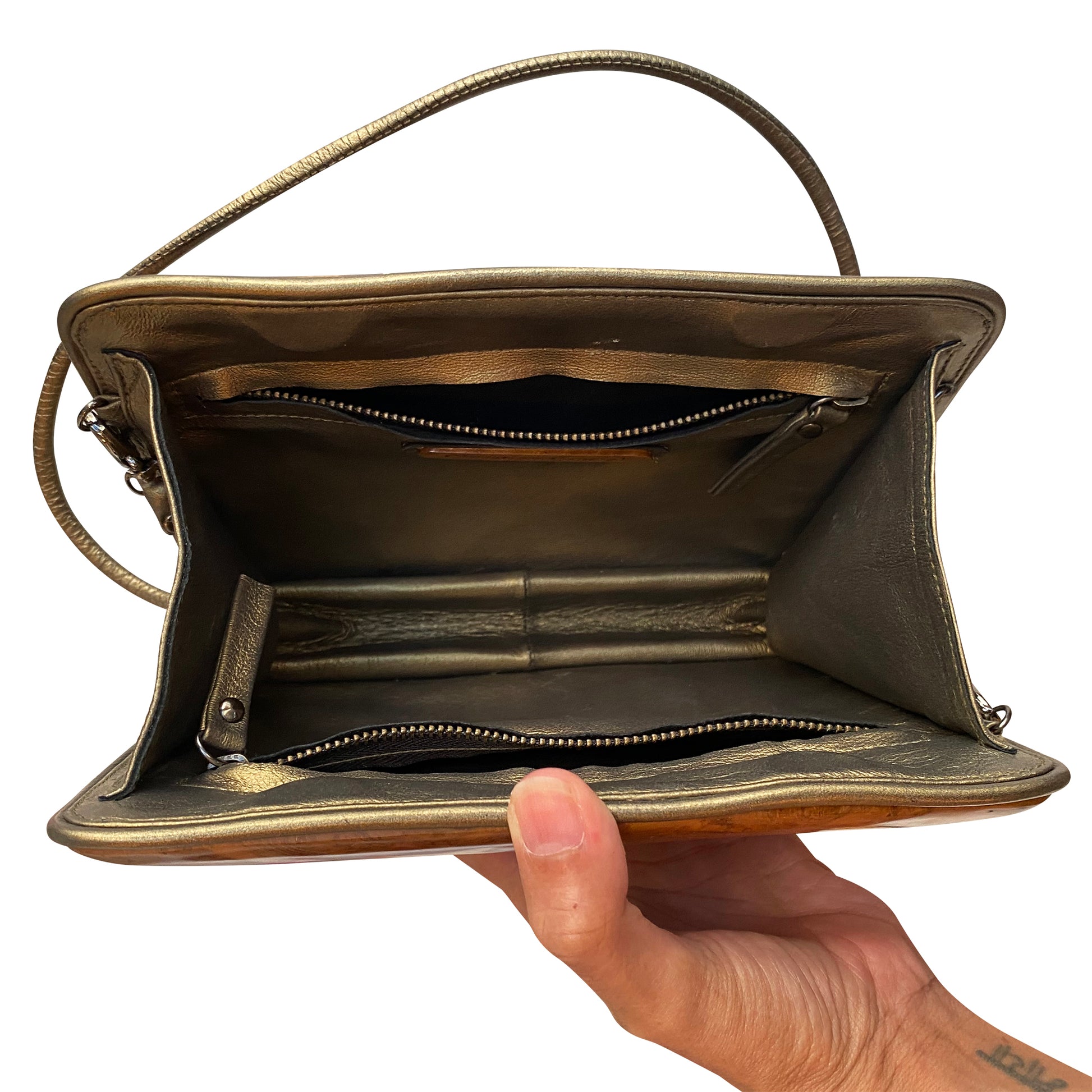 Make a statement with this vintage one-of-a-kind crossbody bag featuring a stunning real wood front panel and metallic bronze leather sides. With a structured silhouette, detachable strap, and dual zip compartments for organization, it merges natural beauty with urban functionality.